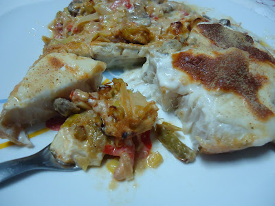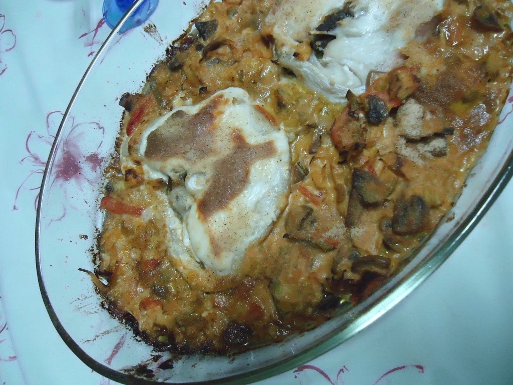 Polvilhar tudo levemente com pão ralado e levar novamente ao forno por mais 10 minutos, até gratinar ligeiramente.Não sei se pela foto dá para perceber, mas os legumes ficam muito cremosos e o peixe fica com uma "capinha" deliciosa de queijo que, quando se come, escorre suavemente pela posta. Receita aprovada!!!