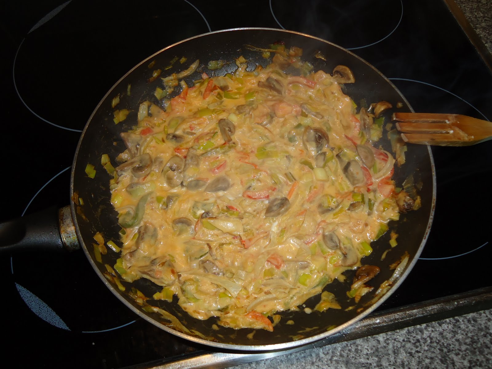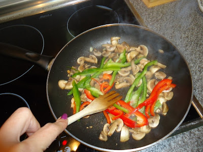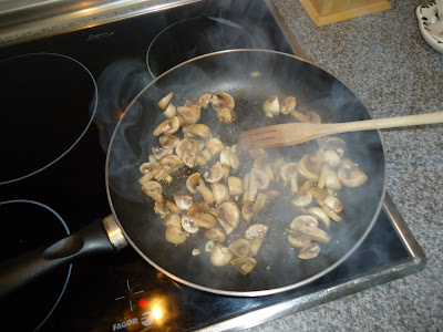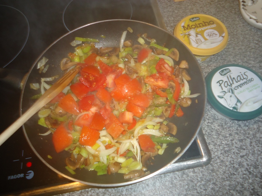 Numa frigideira com um pouco de azeite saltear o alho picado e os cogumelos laminados, temperando com uma pitada de pimenta.Depois juntar os pimentos cortados em tirinhas, deixando saltear mais um pouco até os pimentos começarem a amolecer.