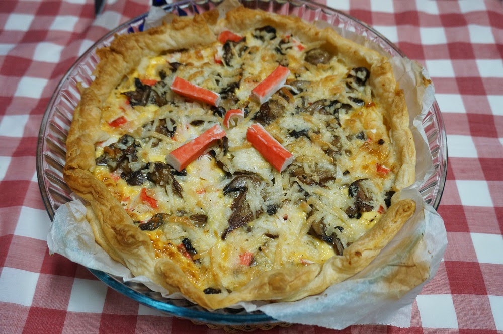Corte as delícias do mar às rodelas e disponha-as sobre o atum. De seguida, coloque os cogumelos e polvilhe com o queijo ralado.