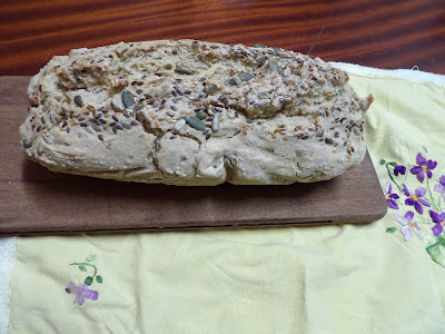 Ao colocar a massa na forma podem humedecer as mãos e passar sobre a massa para alisar. Colocar por cima do pão sementes a gosto e pressionar um pouco para que adiram bem ao pão.