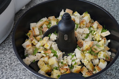 Colocar no copo da Mycook e dar 2 ou 3 toques de Turbo. Baixar o puré das paredes do copo, juntar o queijo e dar novamente 2 toques de Turbo. Juntar o pão ralado, a salsa, os coentros, temperar com sal e pimenta e voltar a pressionar o Turbo várias vezes, até que a mistura se encontre homogénea.
