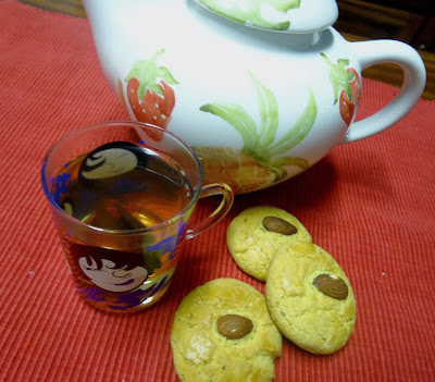 Aproveitei pão duro que tinha, preparei umas fatias (bem à moda algarvia) e acompanhei com este chá que tem um sabor delicioso.