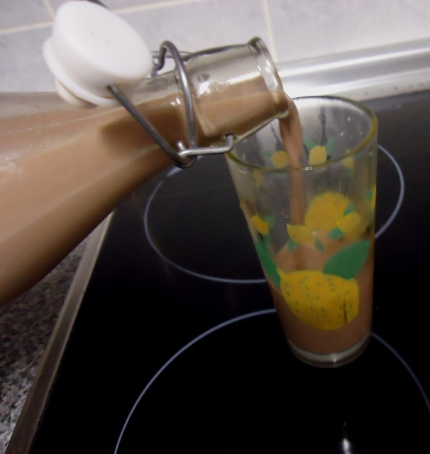 Nota: a mistura, mesmo guardada no congelador, nunca chega a congelar completamente, sendo bastante fácil de retirar as colheres necessárias à preparação da bebida.
