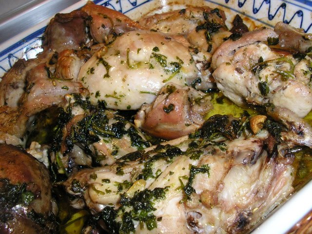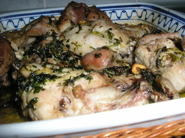 Coloque os peadaços de coelho num tabuleiro juntamente com a marinada, regue com o refogado dos alhos, coentros e azeite e leve ao forno, a 200º, durante 40 a 50 minutos, virando o coelho a meio do tempo e pincelando de vez em quando com o molho.