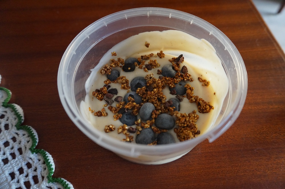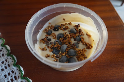 Aqui fica um exemplo do meu lanche antes das aulas de ginástica: iogurte com mirtilos e um pouco desta granola - é uma verdadeira delícia.