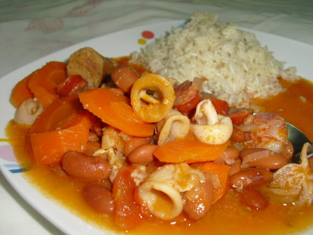 Um dia destes, ao dar volta ao congelador, encontrei uma embalagem com 500gr de lulas e fiquei danada comigo mesma a pensar "Mas porque comprei eu uma embalagem de lulas tão pequena? Isto não dá para nada... Como é que eu consigo fazer uma refeição para 3 ou 4 pessoas com esta embalagem minúscula?"Depois de praguejar contra mim mesma durante alguns minutos, fez-se luz no meu espírito e lembrei-me que fazer uma feijoada não seria má ideia e que desta forma as lulas iriam render uma bela refeição.