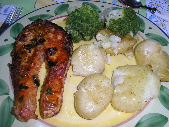 Acompanhamos com as batatas a murro do post anterior e legumes cozidos.