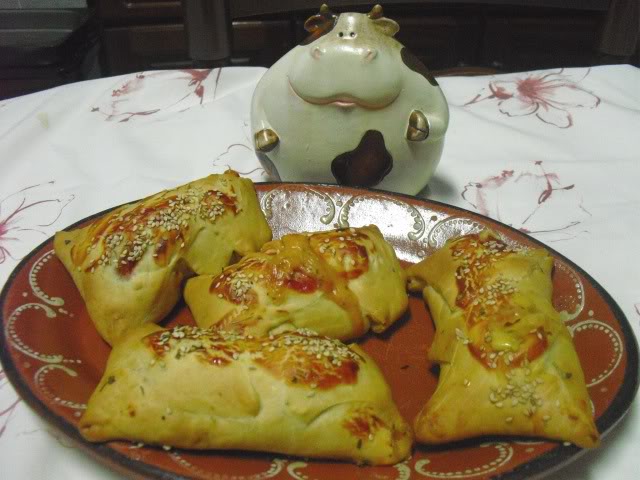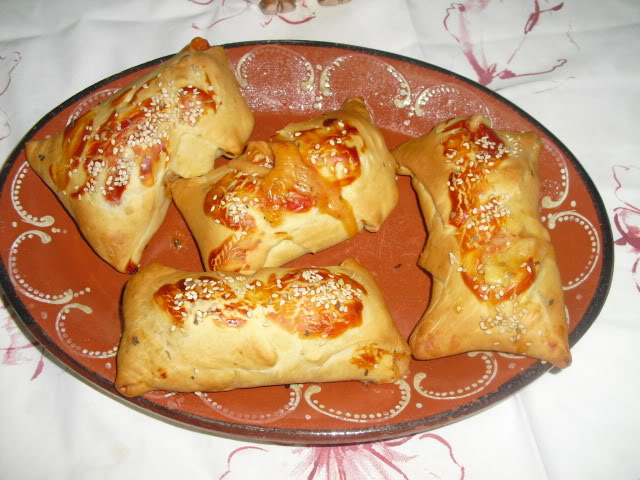 Pincelei com ovo batido, polvilhei com oregãos e sementes de sésamo e levei ao forno a 180º durante 25 minutos.
