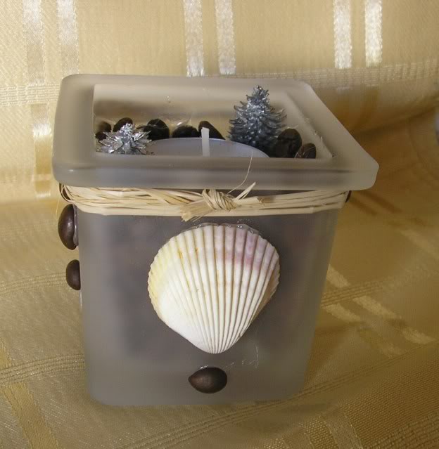 Aproveitei um copo de vidro que tinha sido de uma vela, enchi de grãos de café, coloquei algumas decorações e uma velinha pequena... et voilá... com material que tinha em casa e um pouco de cola quente fiz uma bonita vela, que quando está acesa espalha um agradável aroma a café por toda a sala.