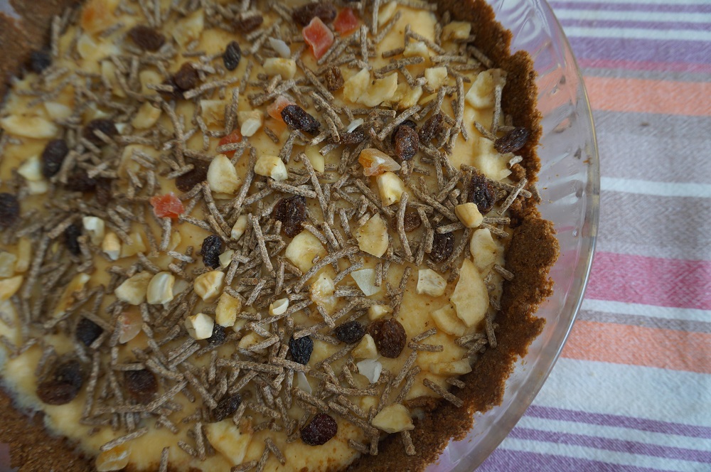 Por fim esmague com as mãos as 40gr de cereais reservados e junte ao resto dos frutos secos. Salpique a tarte com esta mistura e decore a gosto.