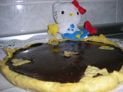 Há certo tempo comprei em promoção umas latas de leite condensado que trazia de oferta uma unidade de leite condensado de chocolate. O que é certo é que a lata andava aos trambolhões na despensa e eu sem saber o que fazer com ela.Improvisei e saíu esta tarte. Fotos do interior da tarte é que não há, pois não foi comida em casa.